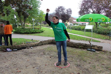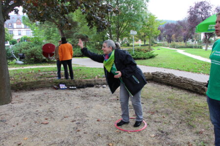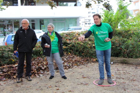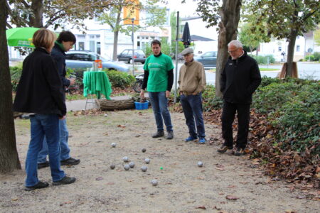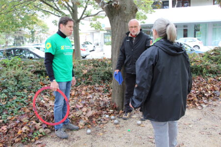 Unser Boule-Spiel auf dem Villenave d’Ornon Platz war ein voller Erfolg. Neben dem eigentlichen Spielen stoppten einige Bürger*innen und zeigten sich erstaunt, dass man auf dem Platz Boule spielen kann. Genau das wollten wir mit unserer Aktion erreichen.