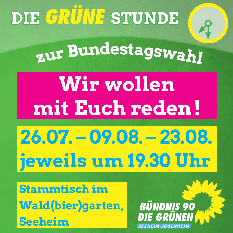 An drei Montagabenden um 19.30 Uhr (26.07., 09.08., 23.08.) laden Bündnis 90/DIE GRÜNEN Seeheim-Jugenheims ein zu einem Stammtisch im Seeheimer Waldgarten. Bei hoffentlich schönem Wetter können Fragen zur Bundestagswahl, zum Wahlprogramm der GRÜNEN, zu politischen Themen gestellt, erörtert, diskutiert werden.
